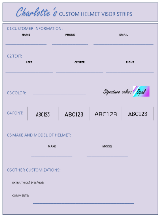 Our daughter (9) is making custom helmet visor strips. They are turning out pretty good! She is selling them for $5 for 2 strips with transfer tape. Made out of good quality removable vinyl. Please send your initials, and desired color, and make/model of your helmet. She would really appreciate the business!