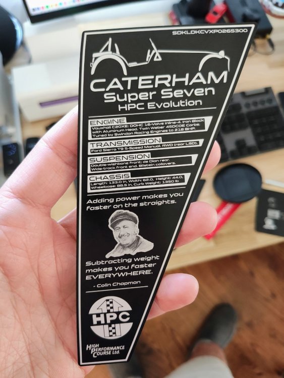 11. So this lower dash trim piece was split in half when I bought the car last year. Earlier this week it snagged on my pants as I was getting out and completely ripped off, revealing the bare metal "chassis" underneath. Seeing as they're essentially impossible to find now, the only proper solution is to replace the entire dash with the newer one-piece style, but that's a bigger project for another day. In the meantime I figured I'd have some fun with my CNC and my laser engraver. I present" the Caterham "knee plate" which is an ABS plastic "frame" with a black, anodized aluminum faceplate. It's SUPER boomer, super gaudy, and super ridiculous, but it was fun to make and it at least looks better than a torn off trim piece. Next up is designing and 3D printing a black "blend piece" to better merge the broken part of the trim piece that you can still see to the back of the bare metal chassis.