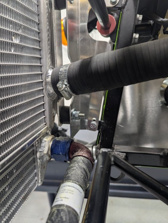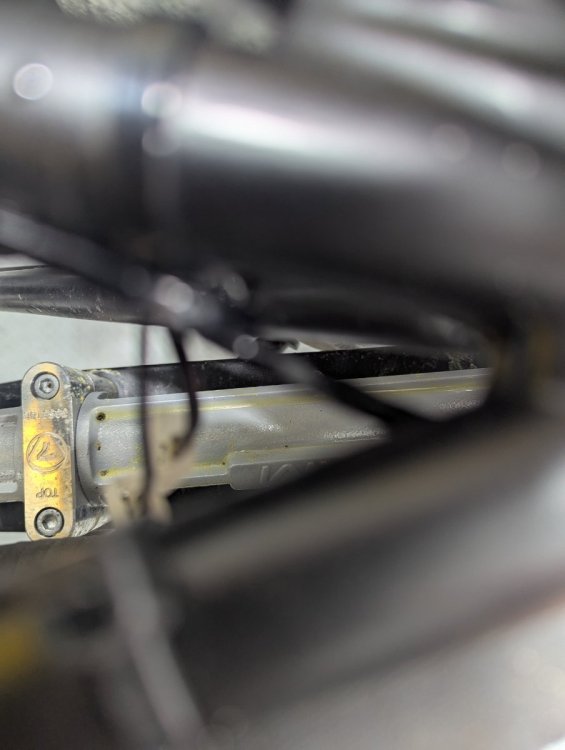 Finally up on the lift, found my coolant leak, not sure which connection it's coming from - but went ahead and tightened all 3 clamps in the line where I see yellow crust. Still at the "min" mark on the tank, so just something to keep an eye on for now