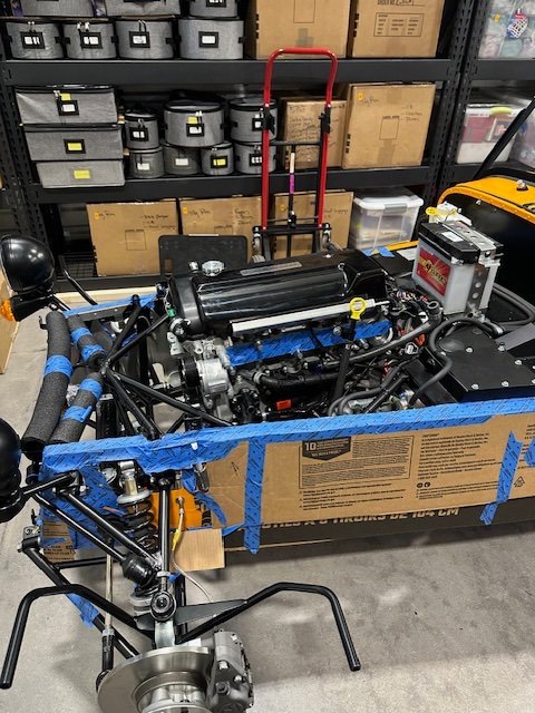 Thanks for the advice on cooling. Got it figured out. My car did not come with any heater so no need to cap, just run line that includes temp sensor from oil cooler through a routing behind the head where you create a route for the submarine to the normal entry point of the submarine line. Photo below of engine installed. We were concerned about difficulty and time, but we did some test lifts playing with angles and distances and were able to get the install done in three hours. I think the key for us was having some high jack stands and an engine hoist that had good reach. I had seen a a lot of discussion about protecting the heat shielding in the tunnel and difficulties removing whatever was used. We ordered some flexible plastic sheeting just a few mils thick. Think of the type of office chair mat, but much thinner. We wrapped it over the top of the transmission tunnel in a u shape and just taped to hold. It did not impede entry and once we got things in position it was easy to pull out right before we installed the transmission brace. We still haven't received our roll cage. It has been a comedy of errors with Caterham not sending, then due to confusion giving ours to a car being built in the factory and then a supposed difficulty getting another from the fabricator. As of this moment we are waiting on confirmation that they are sending. They have told Josh they are going to air freight directly to me. I remain skeptical. Josh has been great through the whole thing, but we are very close to hitting a point where we can't go further without redoing things later so that is a bit frustrating.