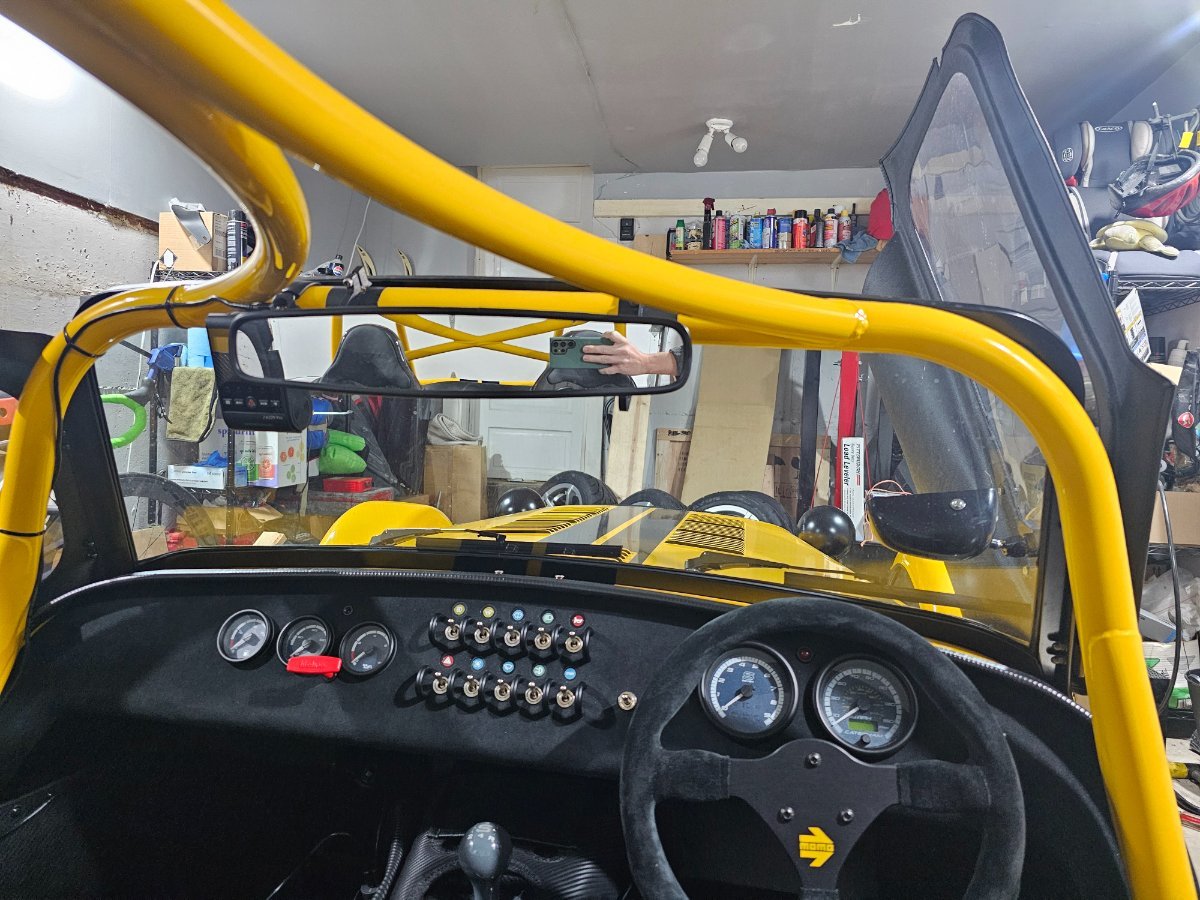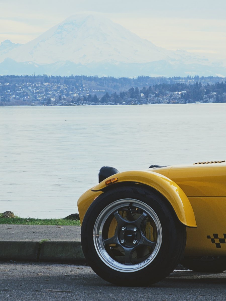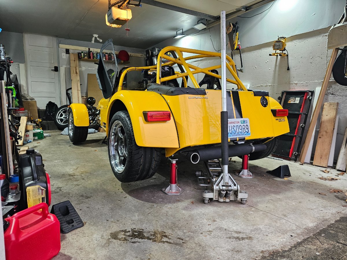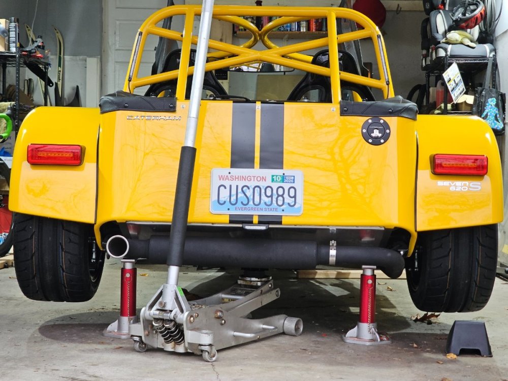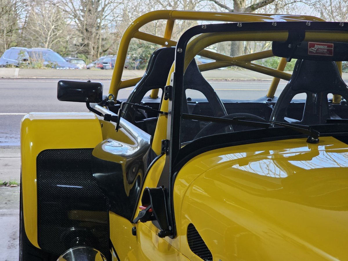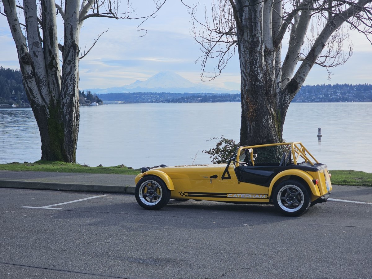 1. Car is now PPF'd on the front cone and hood and sides (thanks Seattle Clear Bra!). Since then, it has been raining, and raining, and more raining, but finally found a day to do a little low speed drive around Lake Washington and sit behind slow drivers. The amount of public support for this car is hilarious. I had more than 10 people come talk to me about it. A car with three little kids U-turned and they all came running out staring haha. The mild dampness showed the supreme capability of these wider tires. Tons of traction. I also tried out the roll bar Spa mirror mounts I Macgyvered together with the extra DPR fixings they graciously sent me when I ordered their door brackets. The distance they are away from the car on the normal doors with the DPR mounts I find it very hard to back up in a straight line into a parking spot, and hard to judge rear fender distance to things next to me. In normal cars, the mirrors stick out to the same width as the car or further, and so you get great perspective for backing up. Not so in the 7. So, for the roll bar mount contraptions I made up, I flipped around the L bracket to get more distance. Much easier now! To minimize time spent converting between rain-mode full doors with DPR mounts and sunny day half-doors with cage mounts, I ordered a second set of Spa mirrors, the GT / Le Mans style this time which are a little taller by about 3/4 inch and wider by about 1-1/2 I believe. I also have a set of coilovers being custom designed for the car by MCS. To-do is measure the motion ratios and then remove the bilsteins to find the un-sprung weights.