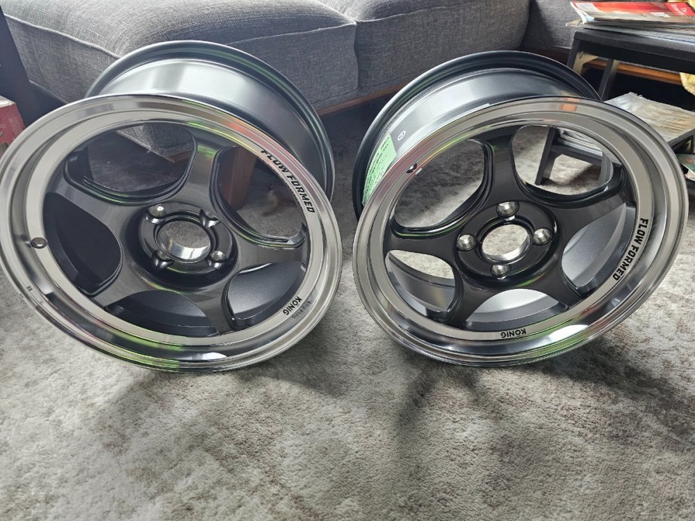 24. Going for gold (anthracite w/ polished lip actually) since the black friday sale is ridiculously cheap compared to anything custom, and have had a good time with Konig on my miatas: Konig Hyperspec 15x7 et35, cb 73.1, 11.3 lb Konig Hyperspec 15x9 et35, cb 73.1, 12.7 lb Australian Caold converters, 4x108 w/ cb 63.4 to 4x100 w/ cb 73.1 20 mm thickness front, 1.1 lb = effective et15 front for total of 12.4 lb 15 mm thickness rear, 1.5 lb = effective et20 rear for total of 14.2 lb How it will sit compared to the 15x6.5 et13 on the car currently: front: rear: