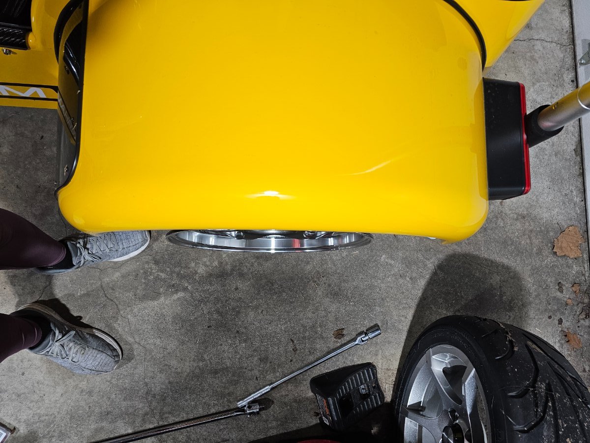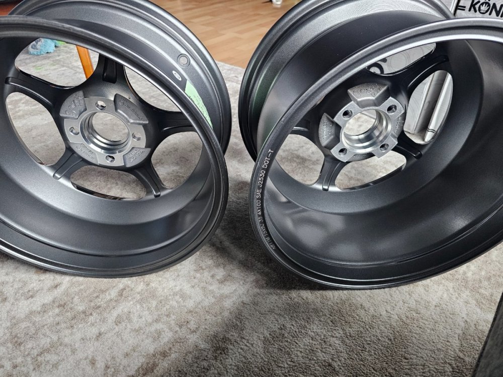 13. Only needed to take off about 1 mm for the 4x108 wheel studs to not interfere with the back of the front wheel reliefs. Coated with some zinc antiseize until I get around to painting it off. The wheel adapters have grade 12.9 studs and seem real beefy, whew. What I did find out is: 1) I am terrible at measuring - the rear hub sure is 63 mm, but the front is more like 58! 2) neither the front nor rear OEM orcus wheels have any hub centric ring spacers, so the front wheels from factory are lug centric! The rear may be too, I ordered a calipers so I can measure the hub sizes better and get a ring for the front at least. 3) I think the wheels will fit perfectly. Mounting tires Thursday. If either front or rear are too wide, I will swap to 195/50 and 225/45 which should certainly have enough stretch in them. Thanks discount tire! Front wheel fitment: Rear Lots of room on the inside, will measure once the tire is on but 1-2 fingers-worth At ride height: Will have to see what the stretch looks like with 245's. I don't think they will bulge out much. It's possible on a two-wheel speed bump it could compress enough to contact the fender, we will see! Ride height from top: Compressed only on wheel side, tons of room.
