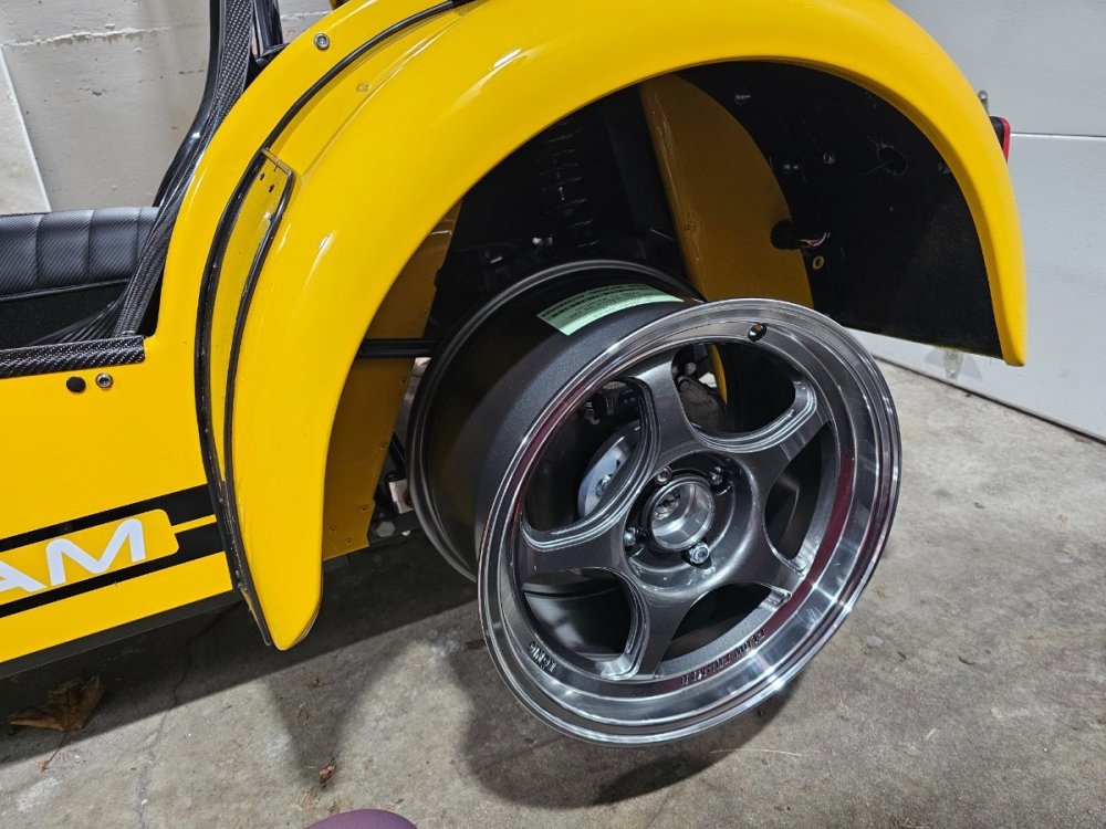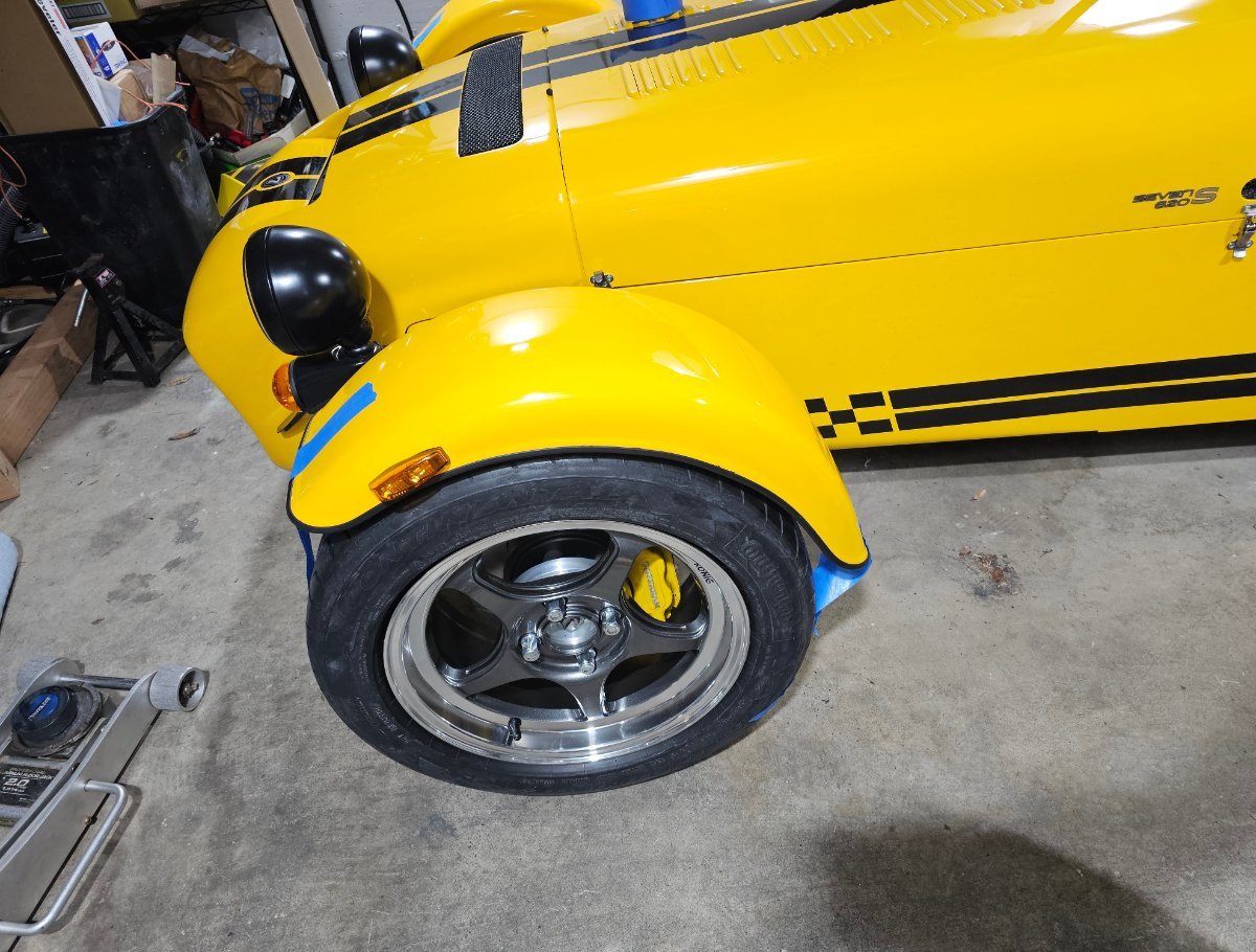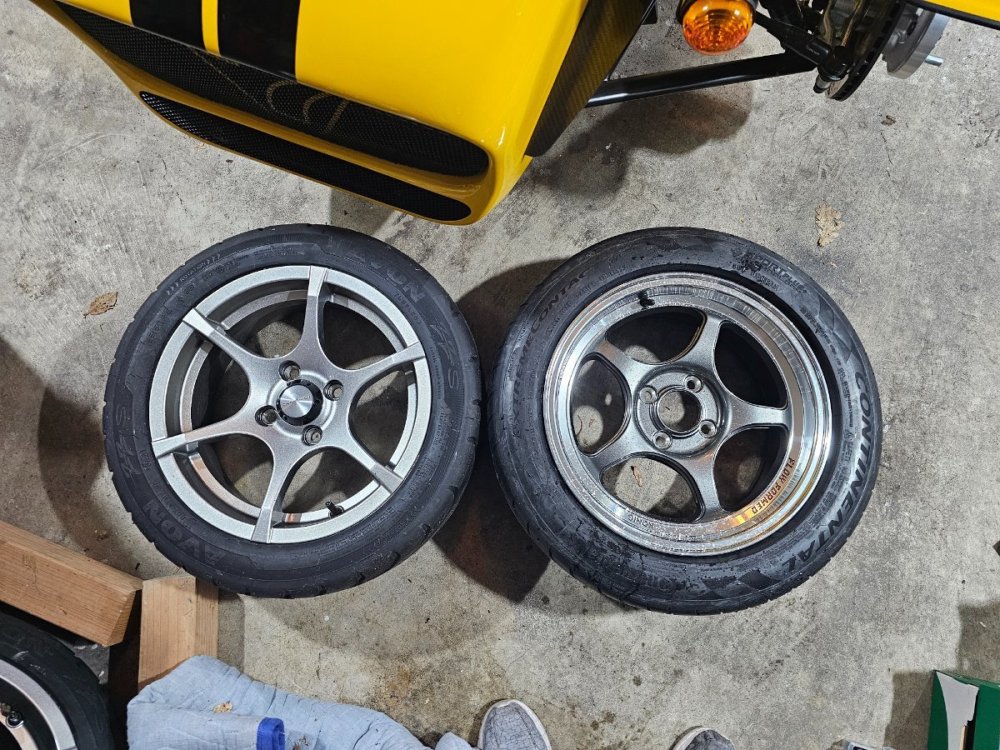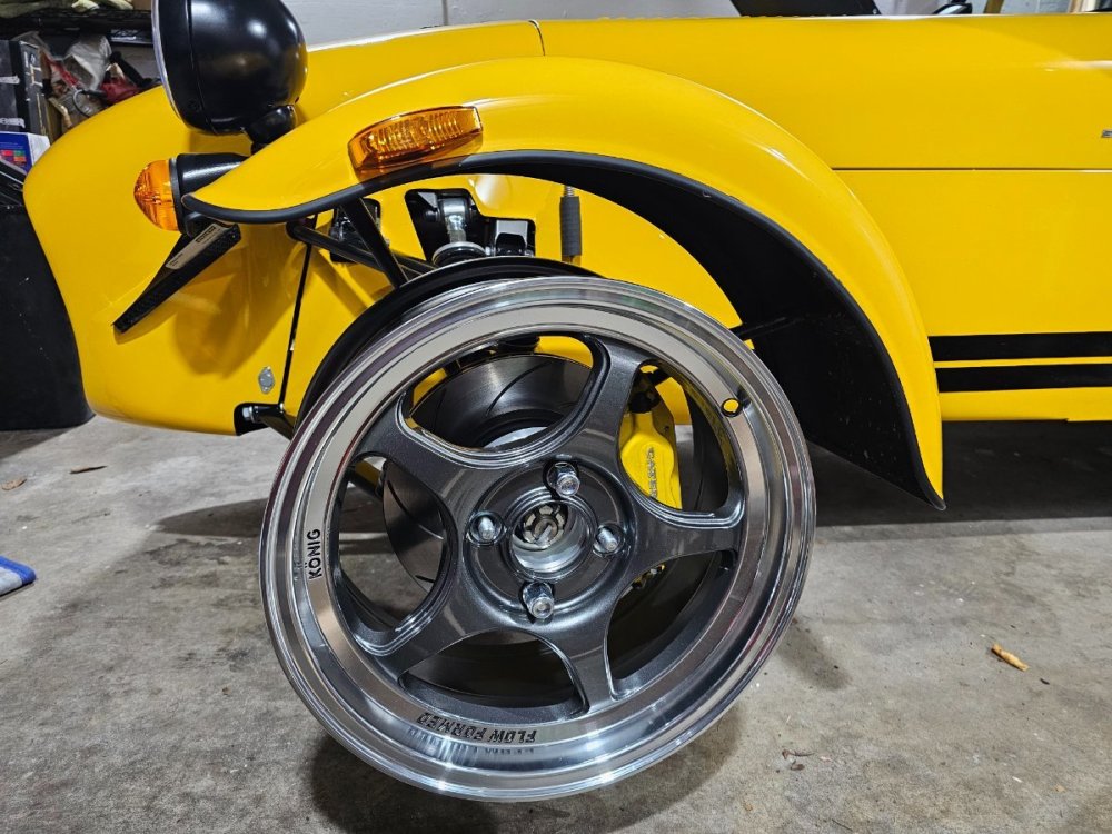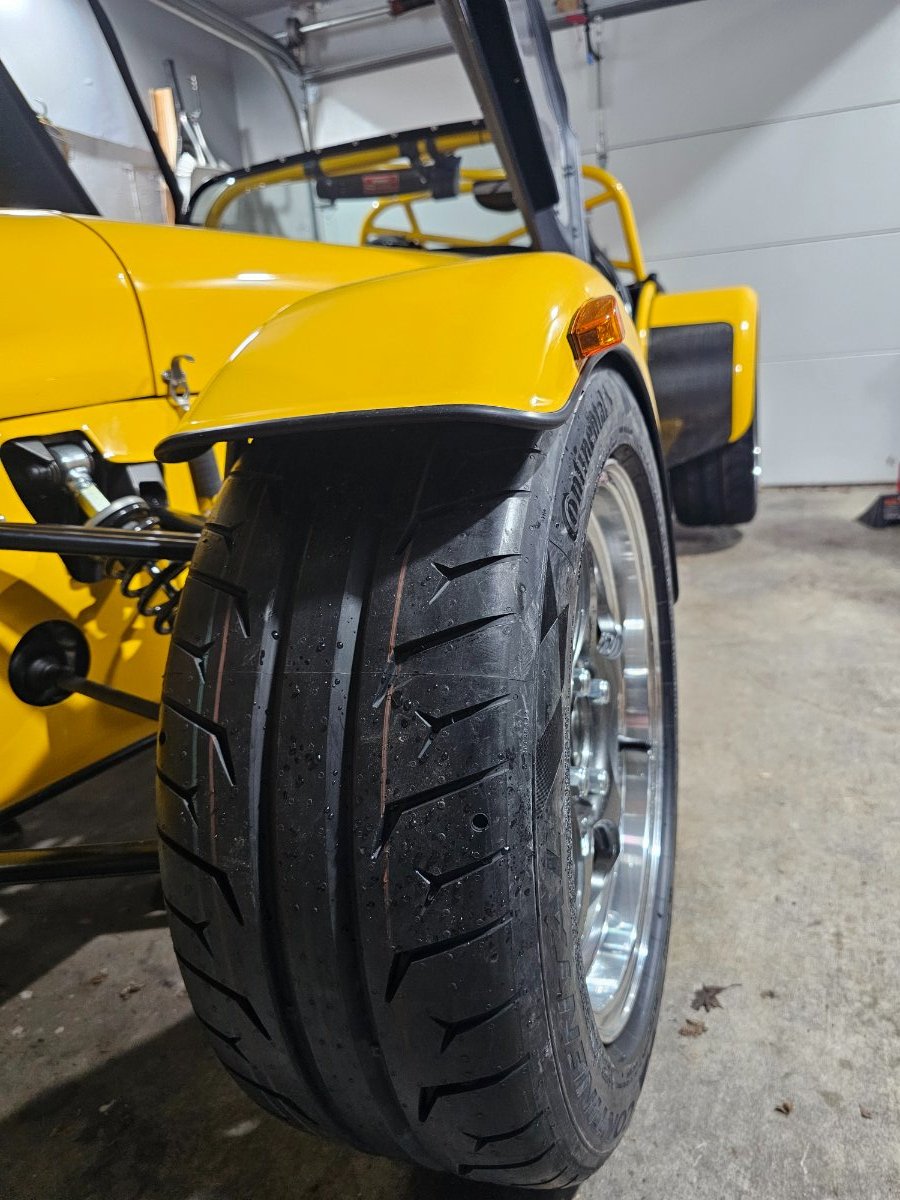 10. Before. This will only be driven to church 😂 Hoping the tires are stiff enough. The existing dampers are height adjustable only. I think the unsprung weight will be nearly the same as the OEM wheels. I suppose I should do the math... Front 20 mm adapters are 1.3 lb each with nuts. Rear 15 mm adapters are 1.1 lb each with nuts. (I had these flipped on the first post. These weights are according to my really accurate bathroom scale with me + adapter - me without adapter). Front 15x7 wheels are 11.3 lb Rear 15x9 wheels are 12.7 lb Front Conti ECF 205/50 are 19 lb Rear Conti ECF 245/40 are 21 lb (From TireRack) OEM orcus 15x6.5 are 13.0 lb (https://caterhamparts.co.uk/lightweight-15-orcus/7513-65x15-orcus-wheel-anthracite.html) OEM Avon ZZS 195/50-15 are 20.7 lb (https://www.arielmotor.co.uk/product/avon-zzs-tyre/) Therefore, corner weight (new) - (old) = Front: (1.3 + 11.3 + 19) - (13 + 20.7) = -2.1 lb Rear: (1.1 + 12.7 + 21) - (13 + 20.7) = +1.1 lb Good thing the inside has so much room. On cornering, compression should keep the whee at a lot of negative camber. A drift over a speed bump might be the worst case scenario where it would tuck without camber change and maybe hit the fender exterior lip. Would be a shame to have to buy carbon fenders!