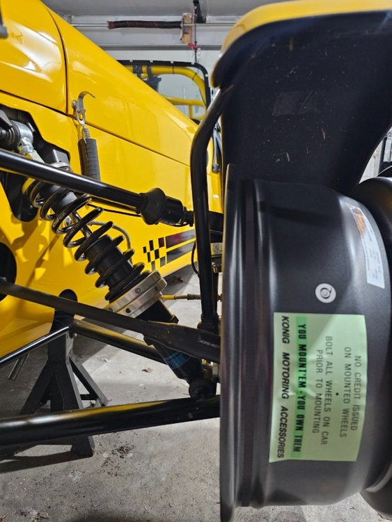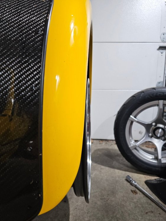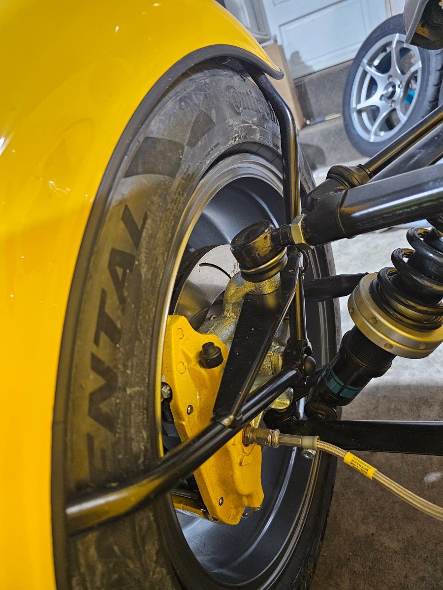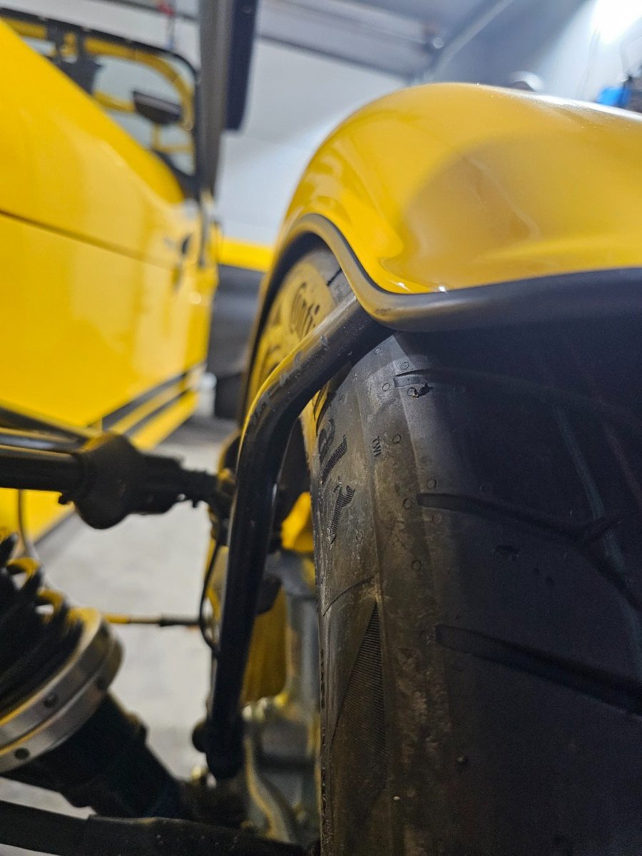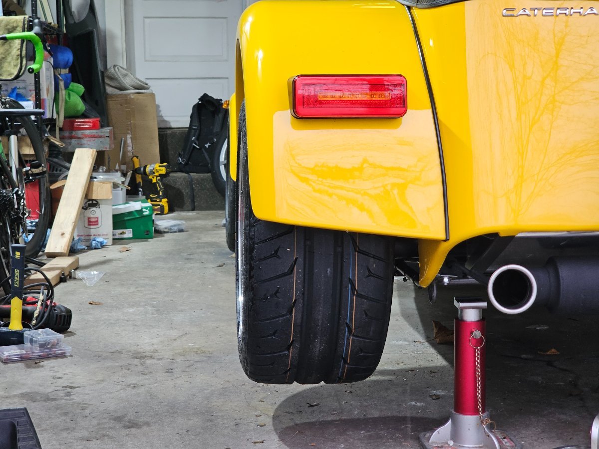 10. Before. This will only be driven to church 😂 Hoping the tires are stiff enough. The existing dampers are height adjustable only. I think the unsprung weight will be nearly the same as the OEM wheels. I suppose I should do the math... Front 20 mm adapters are 1.3 lb each with nuts. Rear 15 mm adapters are 1.1 lb each with nuts. (I had these flipped on the first post. These weights are according to my really accurate bathroom scale with me + adapter - me without adapter). Front 15x7 wheels are 11.3 lb Rear 15x9 wheels are 12.7 lb Front Conti ECF 205/50 are 19 lb Rear Conti ECF 245/40 are 21 lb (From TireRack) OEM orcus 15x6.5 are 13.0 lb (https://caterhamparts.co.uk/lightweight-15-orcus/7513-65x15-orcus-wheel-anthracite.html) OEM Avon ZZS 195/50-15 are 20.7 lb (https://www.arielmotor.co.uk/product/avon-zzs-tyre/) Therefore, corner weight (new) - (old) = Front: (1.3 + 11.3 + 19) - (13 + 20.7) = -2.1 lb Rear: (1.1 + 12.7 + 21) - (13 + 20.7) = +1.1 lb Good thing the inside has so much room. On cornering, compression should keep the whee at a lot of negative camber. A drift over a speed bump might be the worst case scenario where it would tuck without camber change and maybe hit the fender exterior lip. Would be a shame to have to buy carbon fenders!