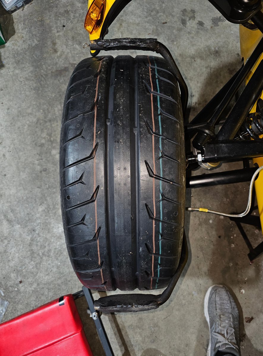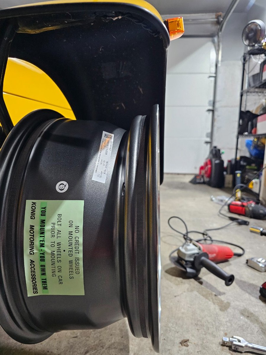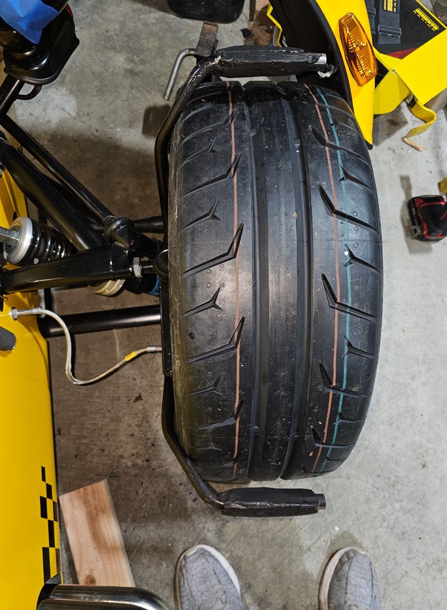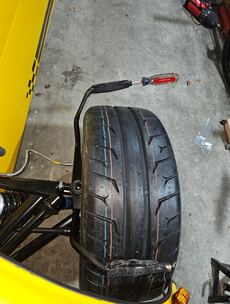 10. Before. This will only be driven to church 😂 Hoping the tires are stiff enough. The existing dampers are height adjustable only. I think the unsprung weight will be nearly the same as the OEM wheels. I suppose I should do the math... Front 20 mm adapters are 1.3 lb each with nuts. Rear 15 mm adapters are 1.1 lb each with nuts. (I had these flipped on the first post. These weights are according to my really accurate bathroom scale with me + adapter - me without adapter). Front 15x7 wheels are 11.3 lb Rear 15x9 wheels are 12.7 lb Front Conti ECF 205/50 are 19 lb Rear Conti ECF 245/40 are 21 lb (From TireRack) OEM orcus 15x6.5 are 13.0 lb (https://caterhamparts.co.uk/lightweight-15-orcus/7513-65x15-orcus-wheel-anthracite.html) OEM Avon ZZS 195/50-15 are 20.7 lb (https://www.arielmotor.co.uk/product/avon-zzs-tyre/) Therefore, corner weight (new) - (old) = Front: (1.3 + 11.3 + 19) - (13 + 20.7) = -2.1 lb Rear: (1.1 + 12.7 + 21) - (13 + 20.7) = +1.1 lb Good thing the inside has so much room. On cornering, compression should keep the whee at a lot of negative camber. A drift over a speed bump might be the worst case scenario where it would tuck without camber change and maybe hit the fender exterior lip. Would be a shame to have to buy carbon fenders!
