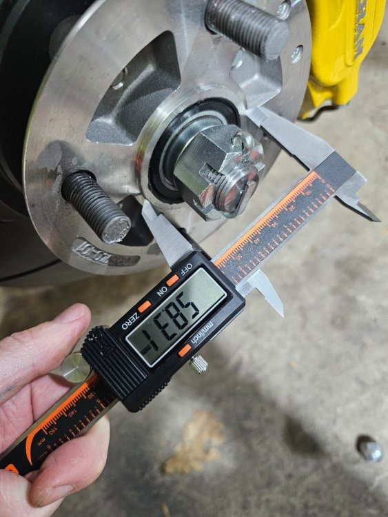 22. Fascinating. I took the wheel off to measure the hub bore, so it's easier to see the sunpension also: Is it typical to have the coilovers near minimum height yet only have 10 mm distance from de Dion to side rail at full droop? I was going to raise the rear up 10-20 mm but not anymore! Is the 150 mm ride height not applicable to 620? Also look how long these springs are, 13 inches! ~50 cm end to end on the shock body. And some hub measurements if anyone or future me needs it:
