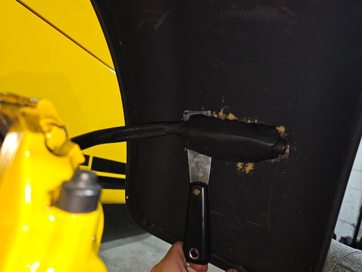 4. Had no fishing wire, razor wire, nor 007 watch-wire on hand. Tried a variety of tools, in the end this puddy knife made short work of the rubber adhesive from the factory. 5 minutes a side pushing / rocking side to side half a width of the puddy knife at a time to get under the adhesive. No knife required. Lots of contact Other side too Time to bend, didn't need more leverage than a thick screwdriver. Bend back down with a spacer, hit it with a hammer while pushing if needed for the rear stays since it's hard to lean on it. Bingo Do for the other 3 Added two bead layers extra Sikaflex 291 on top to make the stays a tad taller to clear the inside of the wing. Thought about cutting some holes to get it lower, but I think it's fine. Once those dried, I added another layer to adhere to the wings and slapped them on. Bing bango Bob's your cousin? I'll add a bunch more from the underside once this dries in place I made the wings slightly more inboard to help reduce side of car debris /things going into my face since the sidewall will stick out just a tad when perfectly centered. Still covers outer tread