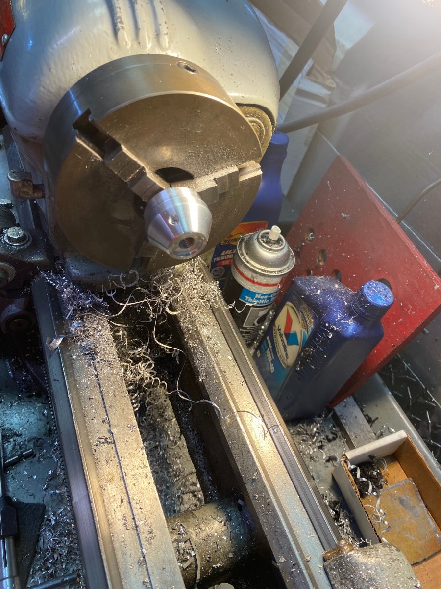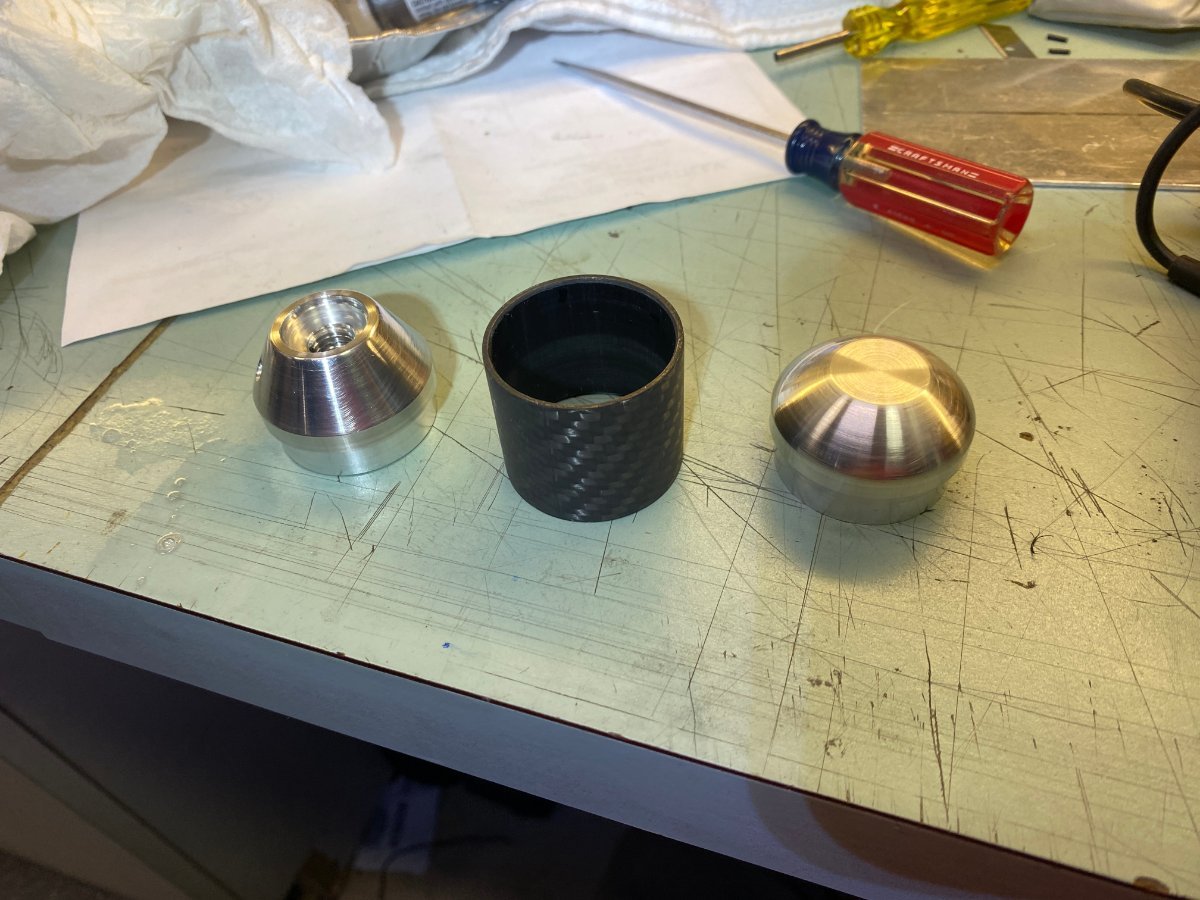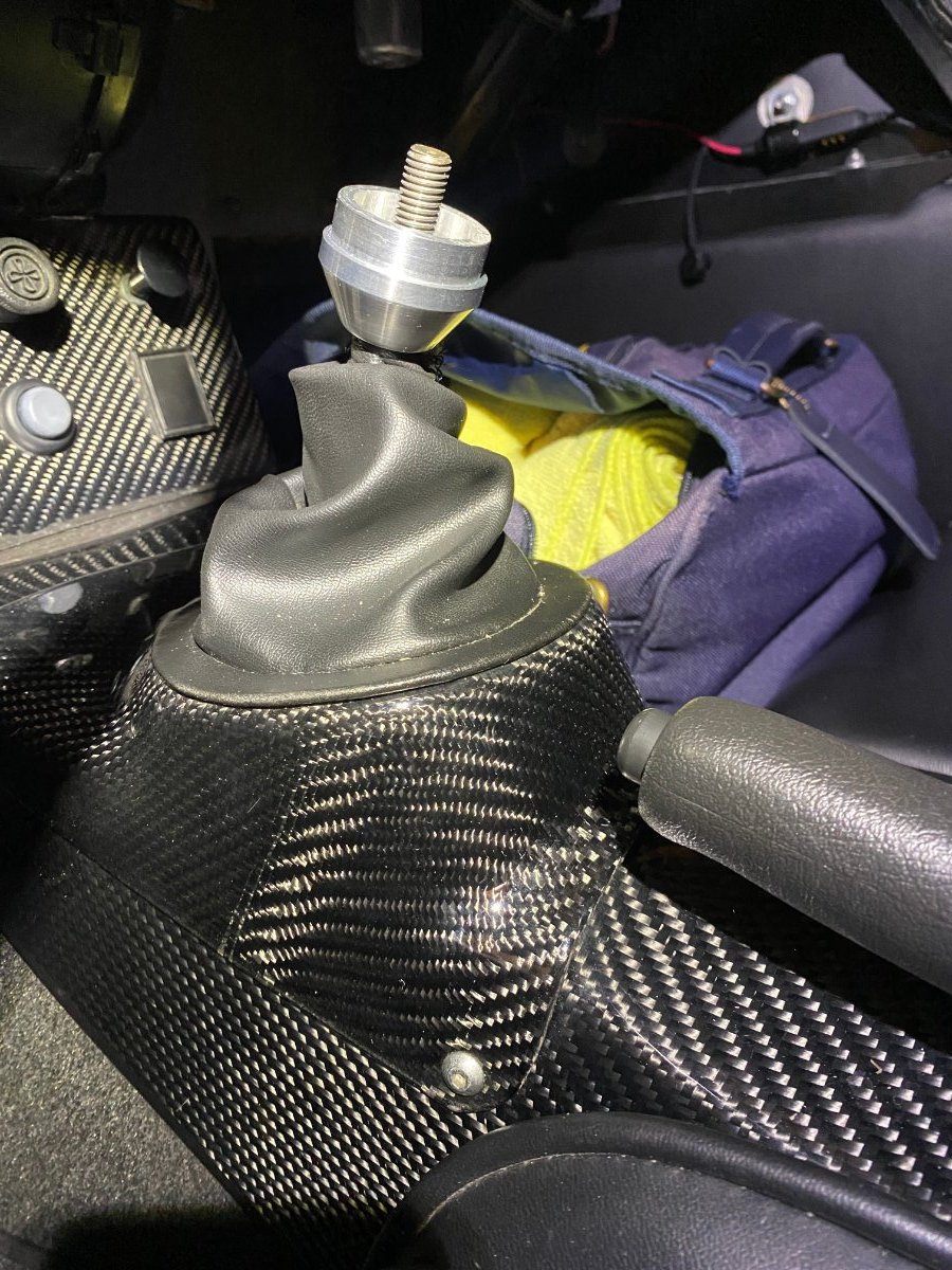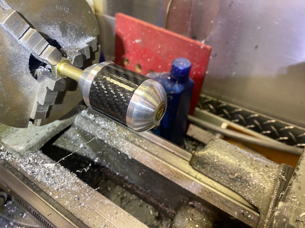 I too make my own shift knobs and various configurations of this theme are on all of my builds. Starting with billet aluminum, I typically machine the base first as that is the trickiest bit and each base is specifically designed for the unique application. The shift knob base for my Vette took me over a week with operations on the lathe and on the mill to get it right! In this case, the threaded shifter shaft of the Ford T9 gearbox required the center hole to be tapped to match the shaft - pretty easy. Here is the lower section after threading the center hold and drilling and tapping a set screw hole: Over the years, I've learned that a test fit is always a good idea before continuing. Good to know if it is right before making the other bits. Happy with that so, skipping a lot of next steps, the rest of the pieces were machined and ready for assembly. After the epoxy cures, for this car I added a Super 7 decal for a little bit of color and then sprayed it with a heavy coat of 2 part automotive clear. It's in the lathe so I can rotate it while the clear cures to prevent drips or sags as I us a pretty heavy coat. And in the car! Works well with my 7 as the whole interior is carbon fiber. Yes, the interior is pretty dirty....been working on several issues with the car and will clean it up after everything is done (which I hope will be soon)!