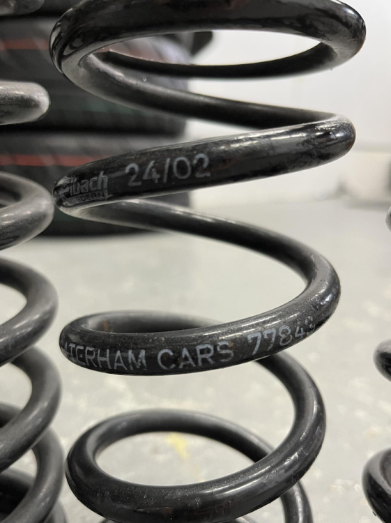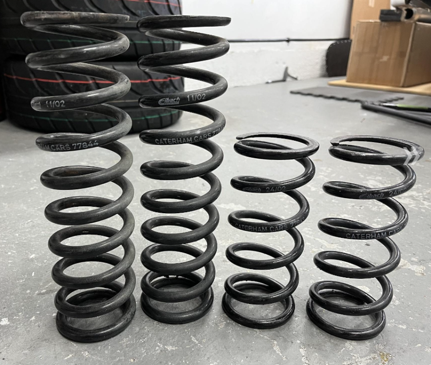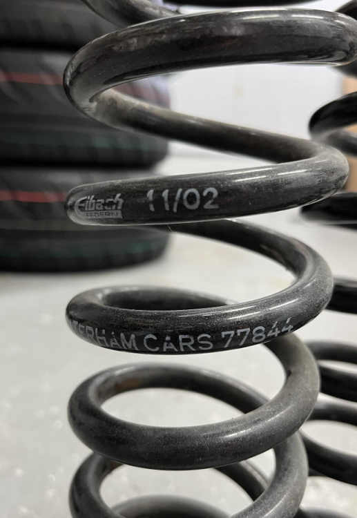 11. I have a set of four used Caterham springs for sale (originally fitted to a set of Bilstein De Dion race dampers). They measure 11" and 7" long in the uncompressed state. The ID is 2.25". Condition is good but they do have some overspray on them and there are some chips on the powdercoat, as you'd expect with use. Caterham part numbers are 77843 (fronts; 250 lb/in spring rate) and 77844 (rears; 215 lb/in spring rate). Here are the links to the parts on the Caterham website: Fronts Rears $150 + shipping, or collected from San Diego, CA.