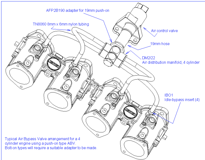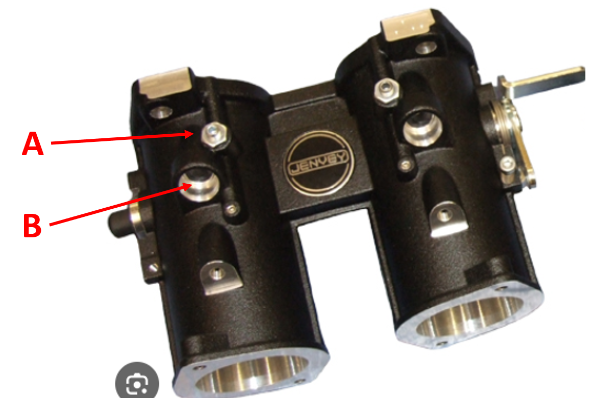 3. Trying to wrap my head around PCV, as I will hopefully be registering my 7 project under SB100 in CA in the not too distant future. My engine is a 2.0 Duratec with wet sump and Jenvey ITBs (direct-to-head). I have configured an "open" crankcase ventilation system, where the factory PCV valve has been removed and the crankcase vents directly into a catch can. My understanding is that, to satisfy the BAR inspection, I would need to pass a hose from this catch can outlet to a vacuum source on the intake (via a PCV valve). Fine. I have two questions about this process: 1. I'm not sure where the best place to source vacuum is on the Jenvey ITBs? I don't want to drill/tap any new holes into the ITBs just for inspection, so it seems there are 2 choices: A and B in the following pic. A is an idle air bypass port, so I believe I could pipe all four of these into a little collector/manifold (using some sort of hose nipple) and then link this to the PCV valve. In fact, it looks like Jenvey sells a kit to do just this, albeit for an idle air control valve instead of PCV - see attached. B is just the injector port, which is blanked off in my application (with an aluminum bung, because I'm using the factory injector port in the cylinder head). So I could do the same thing - drill and tap the aluminum bungs for nipples, without interfering with the idle bypass ports. 2. How savvy are the BAR inspectors when it comes to PCV? Could I avoid all this extra work by just shoving the hose into the air filter backplate? I'm guessing that won't fly, but thought I'd throw it out there!
