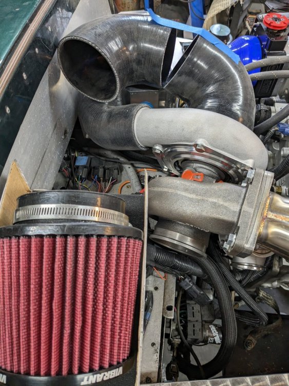 "intercooler installed behind the radiator" That's an interesting choice, your trying to cool you inlet charge with the warm air that is coming thru the radiator. And the intake is close to the turbo, so your putting warm air thru the turbo and then trying to cool it with warm air thru the radiator! I don't think that will change your cooling problem, but it sure would help your performance. If you have a crate engine we must assume the water pump is good. What is the radiator? are you running a thermostat? Graham