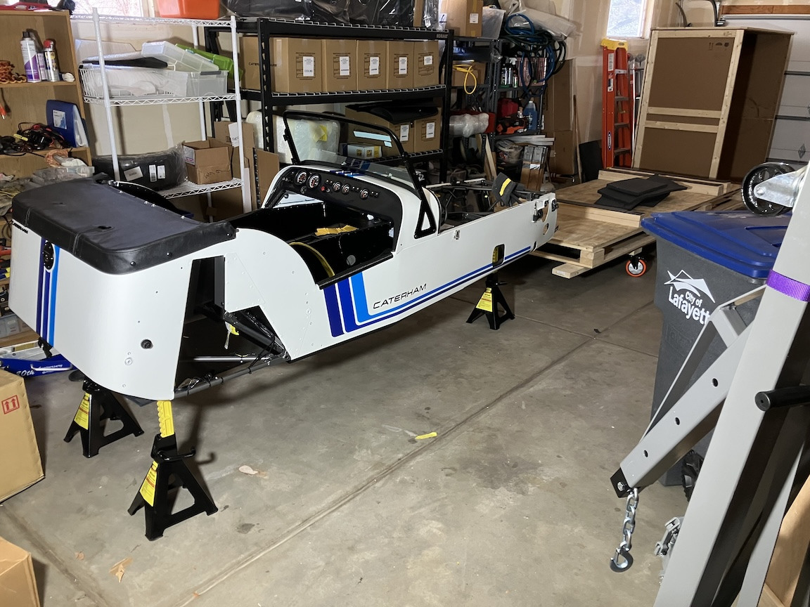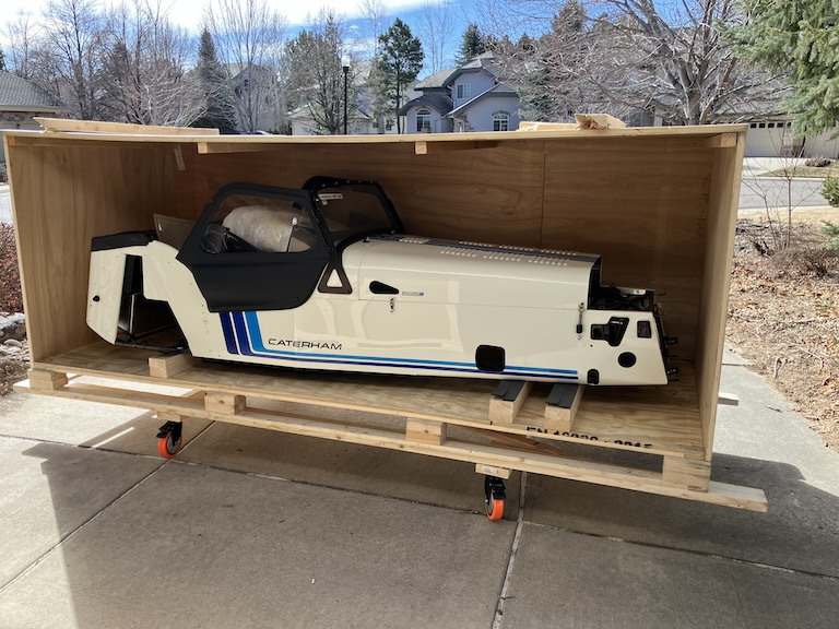 jmaz Posted 2 hours ago Posted 2 hours ago Hi All, I'm in the early stages of assembling a 310 Encore. After reaching (and passing) retirement age, I figured it was pretty much now or never to scratch a long-time itch of owning a Seven, particularly if I was going to do the build myself. The 310 had always felt like the best combination of power and balance for my needs, so when Caterham announced this summer that they were planning a limited run of 25 new 310's, I decided to take the leap after some discussion with Josh Robbins at Rocky Mountain Caterham. The build has gone well so far, with no new issues encountered that haven't already been discussed in the various build blogs and forums. I'd like to thank everyone who has taken the time to document their builds and to help with questions and problems that other builders have run into. It's scary to imagine trying to put the car together using just the official manuals. Along with using Josh R. as a resource, my main go-to blogs so far have been caterham420detailedbuildblog.co.uk and 310build.com. I'll then check several others (cat310s.wordpress.com, www.caterhamr500.co.uk, purplemeanie.co.uk, among others, along with some of the instructional youtube videos such as Caterham 7 Diaries and The Caterham Cave) to help fill in some information gaps. All of them have additional bits of detail and tricks to offer. I'm sure that, so far, I've spent way more time reading than I have on the actual build. Yoram's Yellowjacket build posts here on usa7s proved particularly valuable for suggestions on dealing with the initial hurdle of the crate delivery. Since I couldn't be sure that the delivery truck would have a forklift that would fit in my garage, and having 3 (4, as it turned out) big crates sitting on my driveway in the middle of winter wasn't ideal, I'd followed Yoram's suggestion and construction plans to build a dolly for the chassis crate so that it could be pushed into the garage. I made a second dolly for the engine crate. The delivery donkey lift did in fact turn out to be too tall for my standard-height garage entry, so the dollies saved the day. The tall crate was too high to allow use of a dolly, but the lift operator was able to nudge the crate far enough into the garage. Again following Yoram's suggestion, Once we'd pushed the chassis crate into the garage, my helper (son-in-law) and I used the engine hoist and lifting straps to move the chassis off the crate base and onto jack stands. (Here's a hint from "should have realized that" category: remember to unbolt the chassis from the crate bottom before trying to do the lifting.) I mentioned 4 crates. One of the crates was intended to be delivered to RMC but was left with me by mistake. The chassis is an S3 with lowered floors. 1